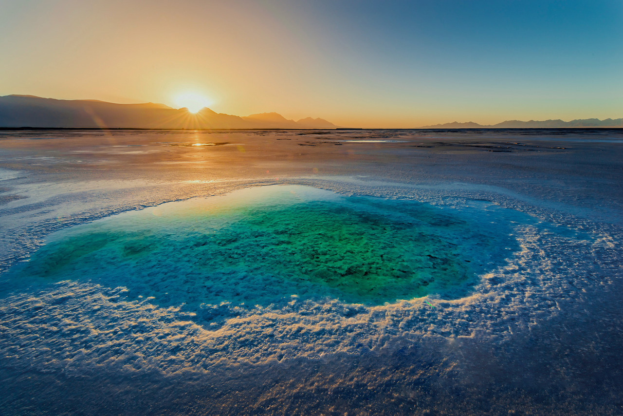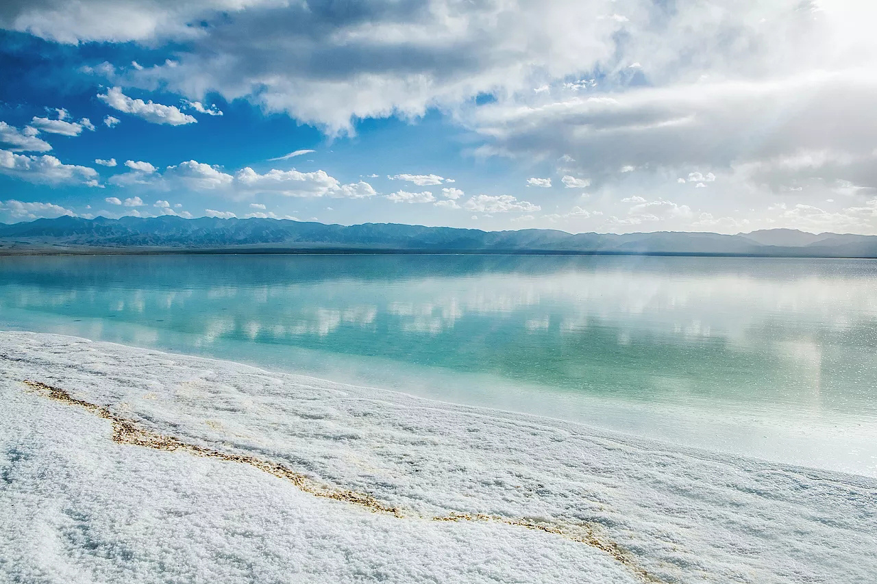 【東臺吉乃爾湖】(游覽時長約 0.5H)一個短時間風(fēng)靡全國的網(wǎng)紅景點,雖然是高原鹽水湖,但它的湖 水卻像大海一般,充斥在瞳孔中的藍,更接近于翠綠色,是如同代表著幸福與浪漫的蒂芙尼寶石的高貴色澤。柔軟而潔白的湖灘是鹽的結(jié)晶,像是融化的奶酪般細膩,被很多人稱其為中國大西北的馬爾代夫。