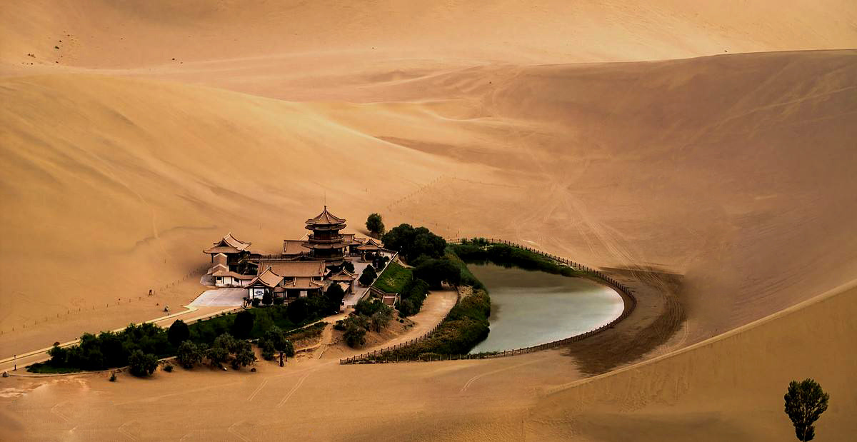 【鳴沙山月牙泉】(游覽時長約2H)它是一汪躺在沙漠之中的泉水,千年不干枯,月牙泉彎曲如新月,因為得名,有“沙漠第一泉”之稱。