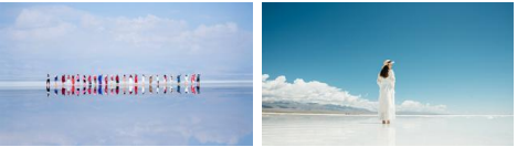 茶卡鹽湖是一座有三千多年歷史的鹽場,湖水含鹽量很大,會自然結晶成為一片白色的湖面,將天空、云朵和對岸的山都倒映在湖