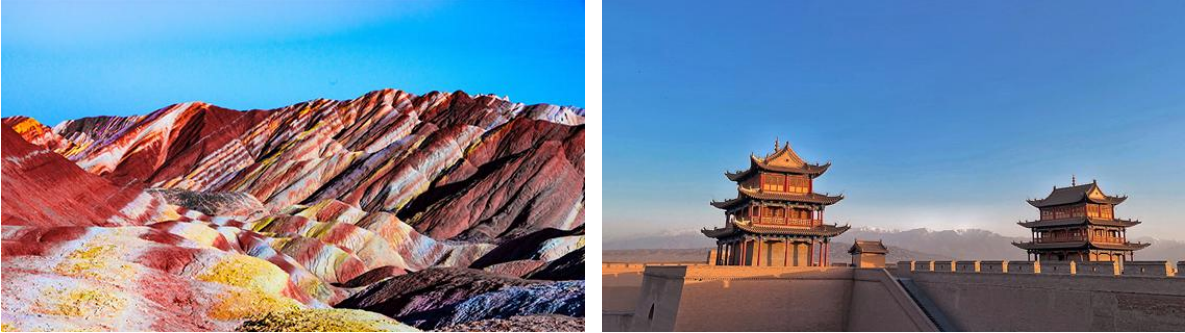 早餐后參觀【張掖七彩丹霞地貌】(含區間車)(游覽約 2 小時),這里是我國丹霞地貌景觀中色彩最鮮亮、地貌造型最豐富的地區之一。被《中國國家地理》雜志評為中國最美的七大丹霞地貌之一;色如渥丹,燦若明霞的張掖丹霞像火焰般炙熱,又有一股橙色的熱情和明亮,它獨特的地貌,縱橫交錯,錯落高低,起伏舒展,迷宮一樣的峽谷,褶皺層巒的巖層和絢麗彩色融為一體的山巒,目不暇接,七彩丹霞一共六個觀景臺,坐電瓶車可觀賞不同的丹霞形態,七彩屏,大扇貝,刀山火海等,4 號觀景臺是最佳的看日落之地,張藝謀的《三槍拍案驚奇》在此取過景。乘車前往嘉峪關(260KM,約 3 小時)。參觀【嘉峪關城樓】(游覽約 2 小時) 嘉峪關關城在嘉峪關市區西南 6 公里處,位于嘉峪關最狹窄的山谷中部,地勢最高的嘉峪山上,城關兩翼的城墻橫穿沙漠戈壁,向北 8 公里連黑山懸壁長城,向南 7 公里,接天下第一墩,是明代萬里長城西端主宰,自古為河西第一隘口。晚住嘉峪關。晚上【大唐美食街】,品嘗當地美食。嘉峪關的飲食可謂百味薈萃。在這里,全國各地的名小吃,都能吃到,本地的烤肉,更是不可錯過哦,烤肉的全面性,豐富到你想不到……