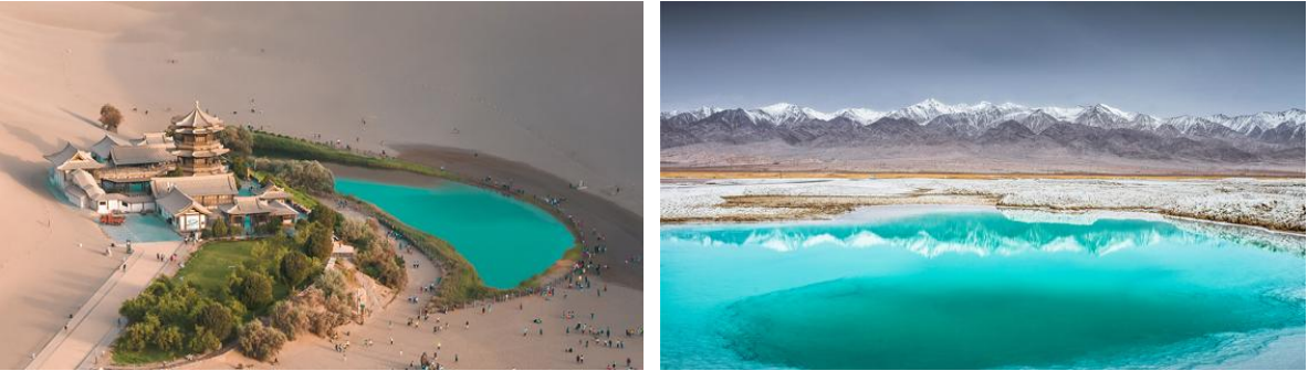 早餐后參觀【鳴沙山月牙泉】(游覽約 2 小時) 古往今來以“山泉共處,沙水共生”的奇妙景觀著稱于世,被譽為“塞外風光之一絕”1994 年被定為國家重點風景名勝區,鳴沙山有流沙積聚而成,沙體遇到摩擦震動,便會殷殷發聲,輕若絲竹,重如雷鳴,故名“鳴沙山”,月牙泉位于鳴沙山北麓,因外形酷似一彎新月,故名“月牙泉”。千百年來不被流沙淹沒,不因干旱而枯竭。后乘車赴大柴旦,途中翻越黨金山,抵達【大柴旦翡翠湖】,大柴旦湖又稱為“翡翠湖”位于青海省海西蒙古族藏族自治州境內,形態迥異、深淺不一的鹽池宛如一塊塊晶瑩剔透的“翡翠”。約 6 平方公里的“翡翠湖”是原大柴旦化工廠鹽湖采礦隊采礦區,經多年開采形成采坑,變成了如今美麗的“翡翠湖”,站在湖邊,宛若鏡面般的湖面倒影著藍天白云和皚皚雪峰,宛如仙境。游畢入住酒店。