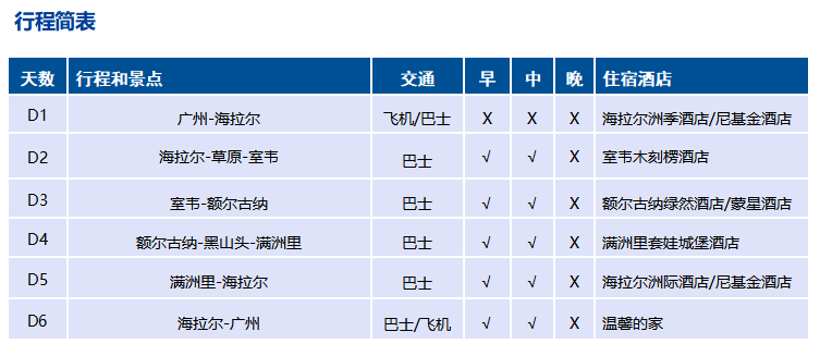 溫馨提示:呼倫貝爾地區為旅游初級城市,基礎設施不是很完善,酒店相對標準較低,行程中所標明的星級標準為當地行業參考標準,任何非官方網站所公布的酒店星級檔次,是屬于該網站自己的評估標準,不代表該酒店的真實檔次或星級,請各位貴賓做好心里準備。