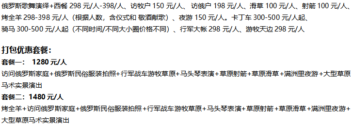 5、嬰兒費用(2 周歲以下):不占座位、不含景點門票、不含當地旅游車位、全程不占床位、不提供早餐及餐費。儀含旅行社責任險費用,嬰兒出游需提前與我社銷售溝通,敬請留意自費項目參考內容:俄羅斯歌舞演繹+西餐 298 元/人-398/人、訪牧戶 150 元/人、訪俄戶 198 元/人、滑草 100 元/人、射箭 100 元/人、夜游 150 元/人。卡丁車 300-500 元/人起烤全羊 298-398 元/人 (根據人數,含儀式和 敬酒獻歌)騎馬 300-500 元/人起 (不同時間/不同大小圈價格不同)、行軍大帳 298 元/人、游牧天邊 298 元/人。
