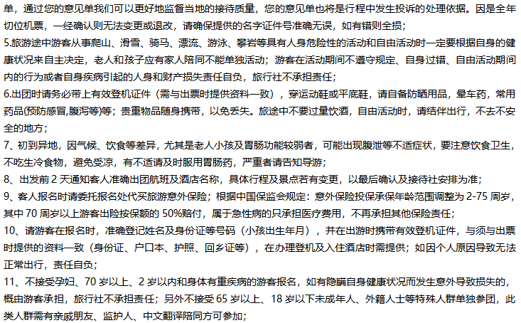 1、老年人或未成年人參團,需家屬或朋友陪同參加,并簽訂《健康證明》和《免責書》。