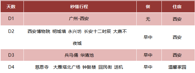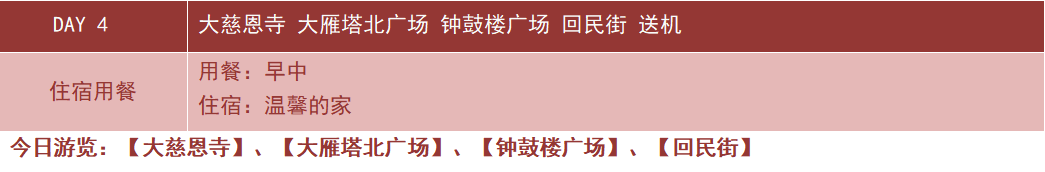 早餐后乘車前往游覽千年古剎之皇家寺院【大慈恩寺】(約1.5小時,登塔自理30元/)。在此我們拂塵凈心,守望長安1300余年的大雁塔就坐落于此。自唐代以來,文人墨客金榜題名加官進爵后,多到大慈恩寺禮佛。后來代代效仿,為求功成名就,提前祈愿,逐漸形成了雁塔題名祈福開運的風俗。凡隨行團友入寺,皆有一份寺院結緣的祈福卡片相贈,親筆提上名字與心愿,為心中的人祈福開運,寄托一份牽掛。后游覽【大雁塔北廣場】(約1.5小時),整個廣場由水景噴泉、文化廣場、園林景觀、文化長廊和旅游商貿設施等組成。整個廣場以大雁塔為中心軸三等分,中央為主景水道,左右兩側分置“唐詩園林區”、“法相花壇區”、“禪修林樹區”等景觀,廣場南端設置“水景落瀑”、“主題水景”、“觀景平臺”等景觀。遠觀西安標志性建筑——大雁塔,相傳唐玄奘從印度取經回國后,為了供奉和儲藏梵文經典和佛像舍利等物親自設計并督造建成的,【鐘鼓樓廣場】--游覽西安著名的坊上美食文化街區【回民街】(約1.5小時),青石鋪路、綠樹成蔭,路兩旁一色仿明清建筑,西安風情的代表之一,聚集了近300種特色小吃,品嘗特色美食:肉夾饃、羊肉泡饃、涼皮等.讓人流連忘返,欲罷不能,游覽完后,擇時送機場乘航班返回廣州結束愉快的行程,返回溫馨的家!